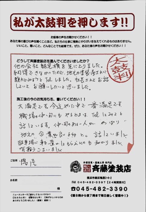 口コミ評判信用・満足 カスタマーレビュー ★★★★★ Q.どうして斉藤塗装店を選んでくれたのですか? Q.今の気持ちを教えて! 塗替えをお考えの方は、ぜひ塗装職人専門店の斉藤塗装店をお尋ねくださいね。